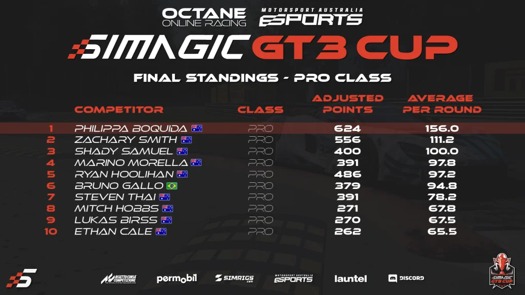 With six rounds forming part of the Octane Online Racing-run series, Boquida won four of the six events, beating runner-up Zachary Smith by 68 points, while Shady Samuel rounded out the top three a further 156 points behind.