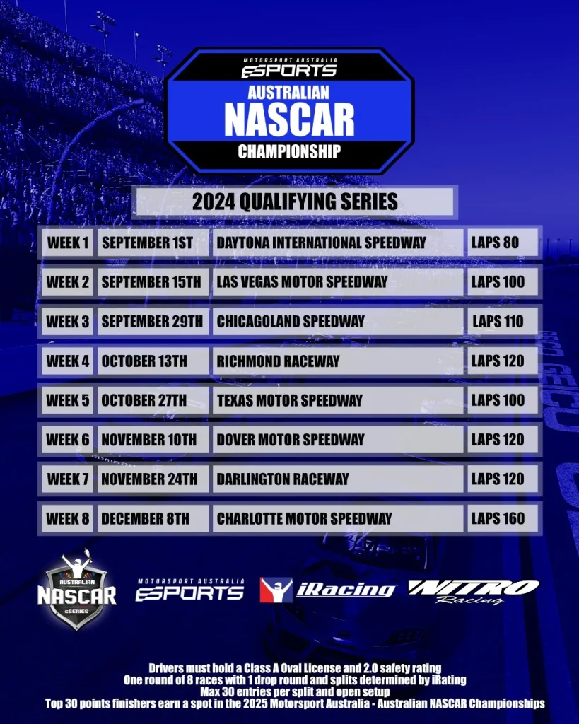 The Motorsport Australia NASCAR Esports Championship Qualifying Series will consist of eight races taking place from early September to December. Entries for this qualifying series are now open and close on Friday, 27 September 2024.
